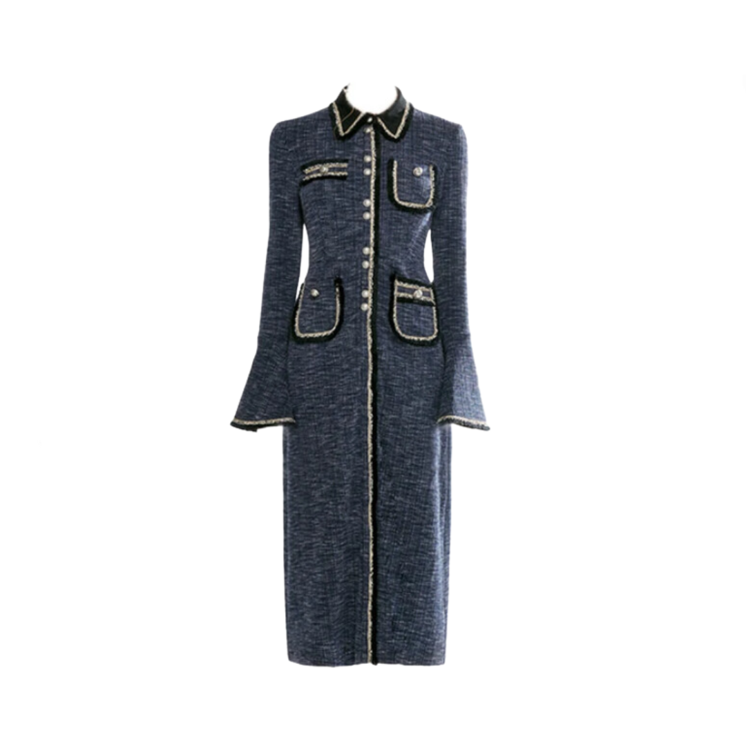 Expertly crafted from a tweed fabric. this midi dress features a classic collar and functional front pockets. The long sleeves provide added coverage. making it perfect for any occasion.