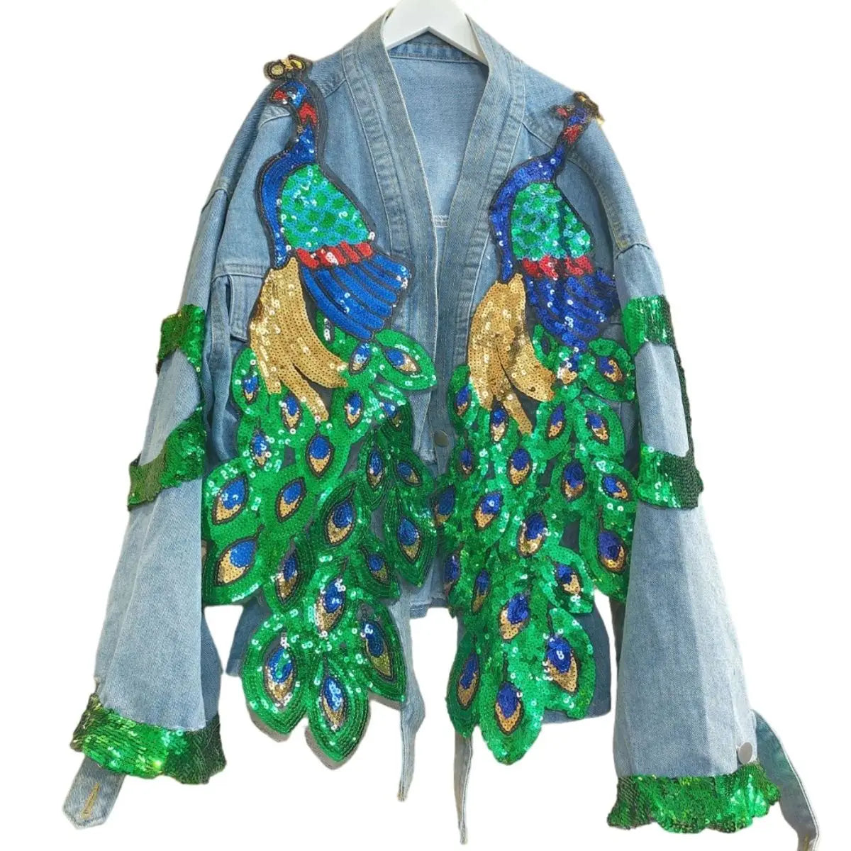 This V-neck denim jacket features stunning 3D peacock sequined embroidery. adding a touch of elegance and sophistication to your wardrobe. The intricate design and detailed craftsmanship make this jacket a statement piece that will elevate any outfit.