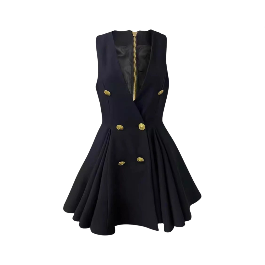 This elegant V-neck dress features a double-breasted design and high waistline. creating a flattering and sophisticated silhouette. The classic style and quality construction make it a timeless addition to any wardrobe.