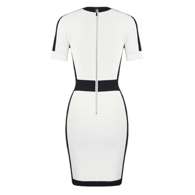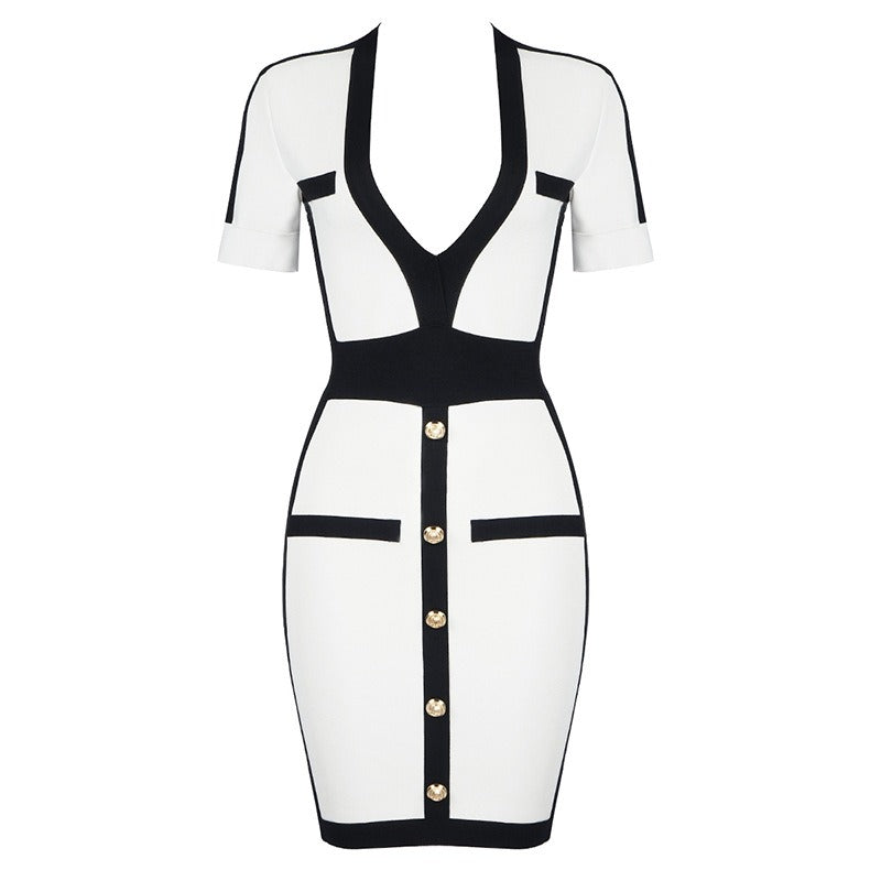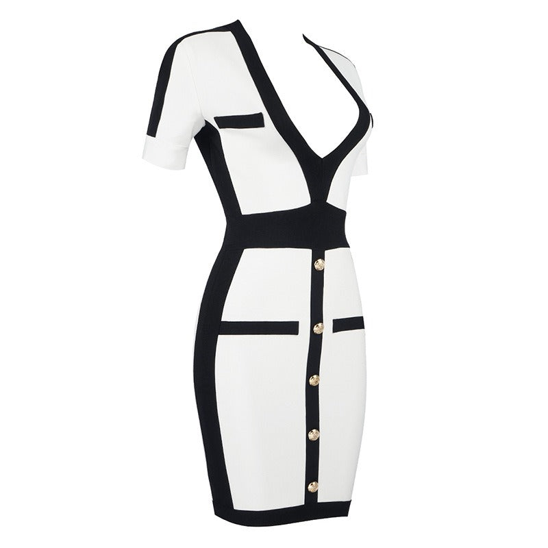 Dress to impress in our V-Neck Patchwork Bodycon Dress. Its sleek design and button details will accentuate your curves. while the v-neck adds a touch of sophistication.
