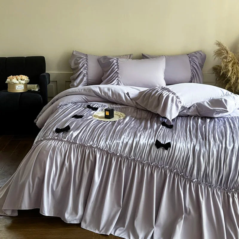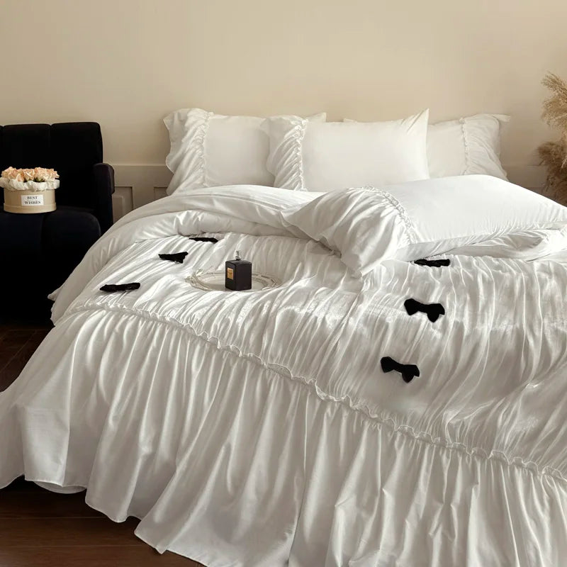 Vintage French Large Ruffles Black Bow Princess Bedding Set Duvet Cover Set Flat/Fitted Bed Sheet Pillowcases Pillowcases 4Pcs