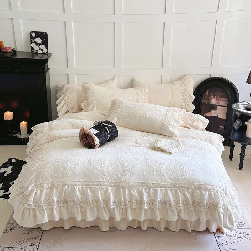 Vintage French Style Lace Ruffles Carved Velvet Wedding Bedding Set Duvet Cover Set Bed Sheet Fitted Sheet Bed Skirt Pillowcases