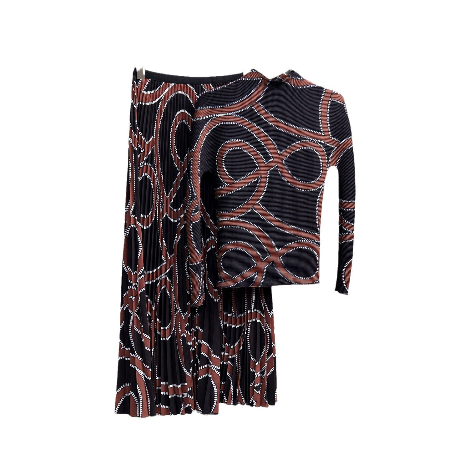 Stay trendy with this Vintage Geometric Printed Turtleneck Pleated Set. Made with 2 pieces. this skirt set features a vintage printing design and turtleneck fold. giving it a unique and stylish look. The long elastic waist skirt offers comfort and versatility. making it perfect for any occasion.