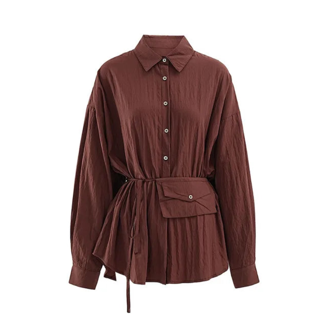 This Waist Bag Tie Loose Button Up Blouse combines fashion and functionality. Made from high-quality materials. it has a waist bag tie for added convenience. Its loose fit and button-up style make it versatile for any occasion. Stay organized and stylish with this blouse.