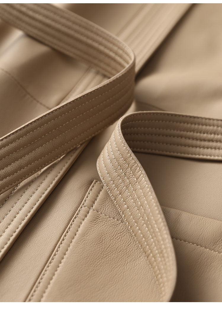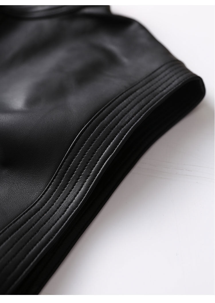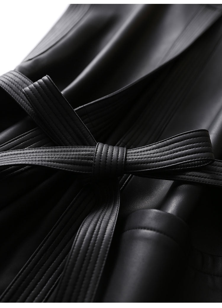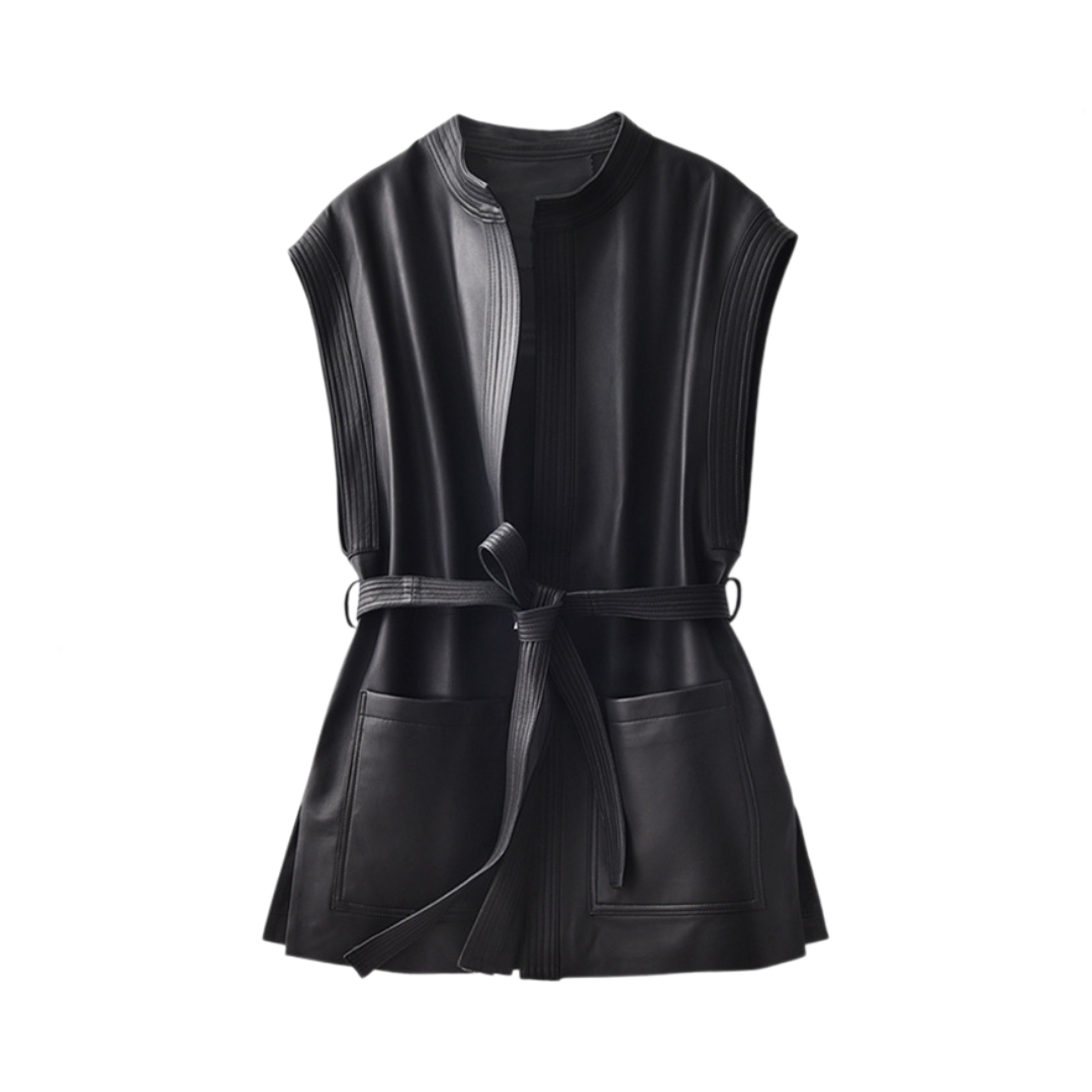 This Waist Cinched Leather Sleeveless Coat expertly combines fashion and function. Made with vegan leather. it features a waist cinching detail to accentuate your figure.