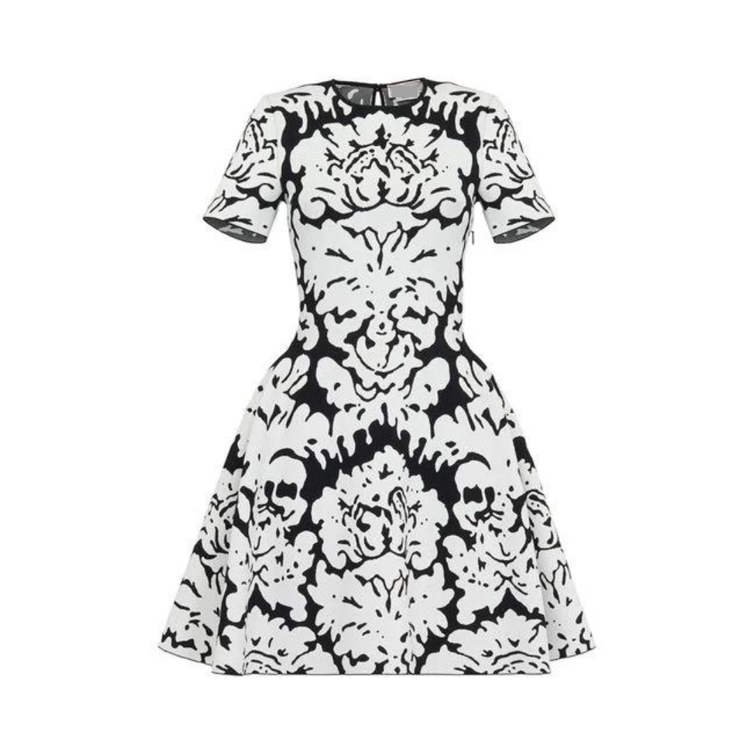 Expertly crafted with a white jacquard knit. this dress combines style and comfort. The intricate jacquard pattern adds a touch of elegance. while the knit fabric drapes beautifully on the body.
