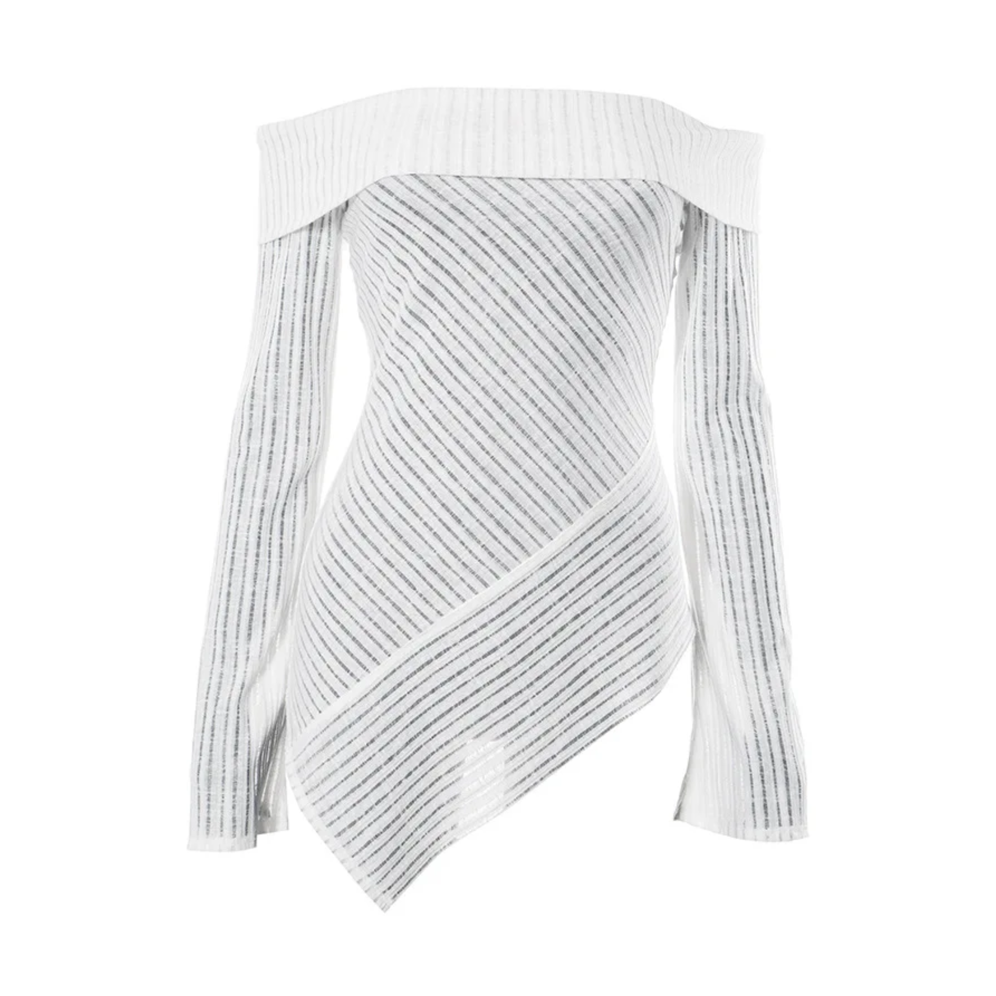 Upgrade your fashion game with our White Knitted Off-Shoulder Stripe Long Sleeves Top. Featuring a slash neck design and slim fit. this top will make you stand out from the crowd. Made with high-quality knitted material for comfortable wear.