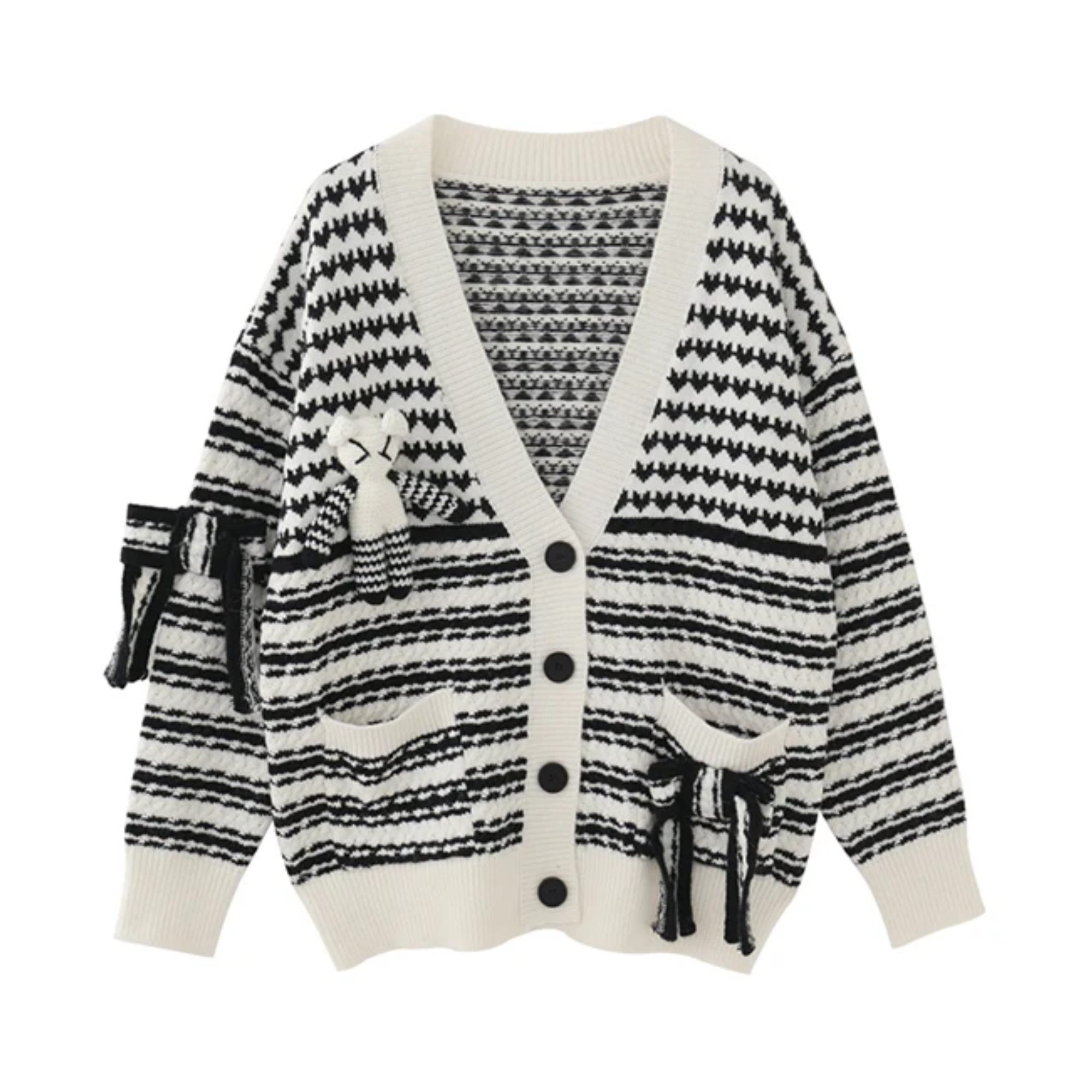 This is a white knitted v-neck cardigan sweater. perfect for the autumn and winter seasons. Its vintage button up style adds a touch of fashion to the casual look. while the loose fit and striped design provide both comfort and style. Stay warm and stylish with this must-have cardigan.