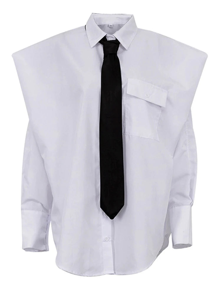 This white shirt boasts a tie and broad shoulder design. adding a touch of sophistication and style to any outfit. The broad shoulders create a powerful yet elegant silhouette. while the tie adds a subtle touch of femininity.
