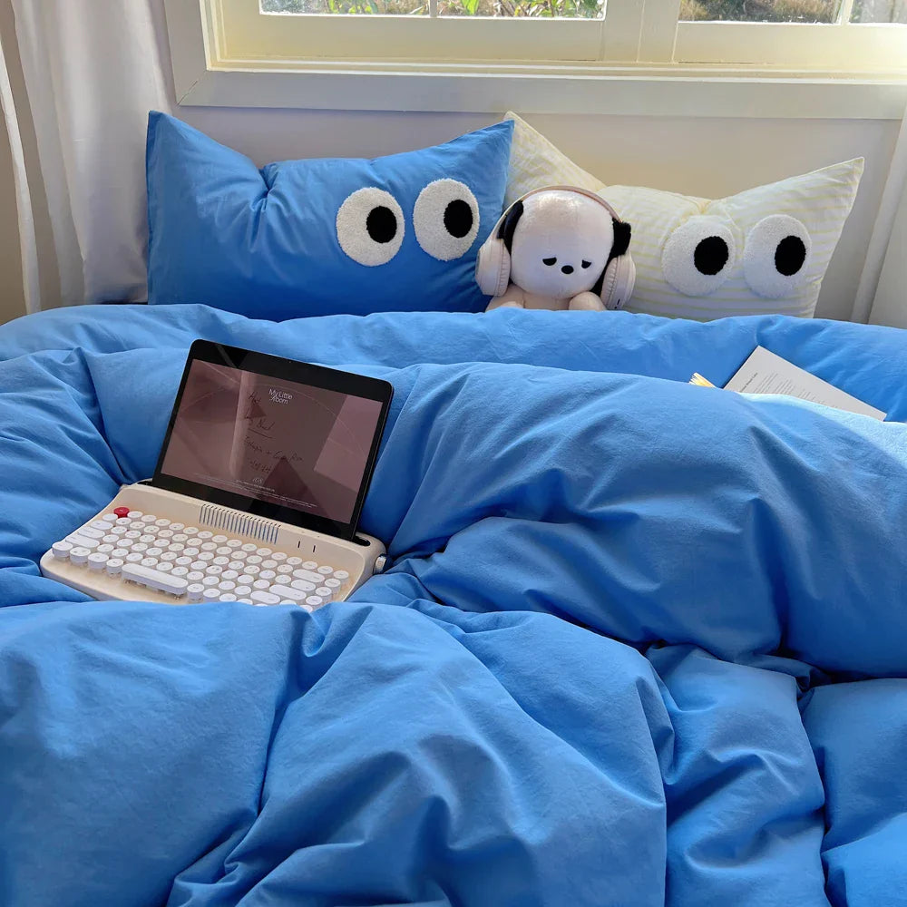 Yeknu Ins Black Big Eye Solid Color Bedding Set Girls Boys Flat Sheet Blue Duvet Cover Pillowcase Washed Cotton Bed Linen Home Textile