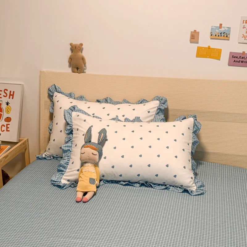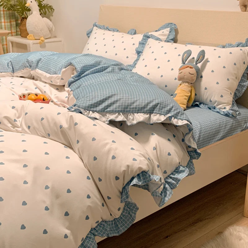 Yeknu Korean Princess Style Bedding Set Soft Skin-friendly Lace Ruffles Quilt Cover Blue Heart Printed Duvet Covers Pillowcases Sheet