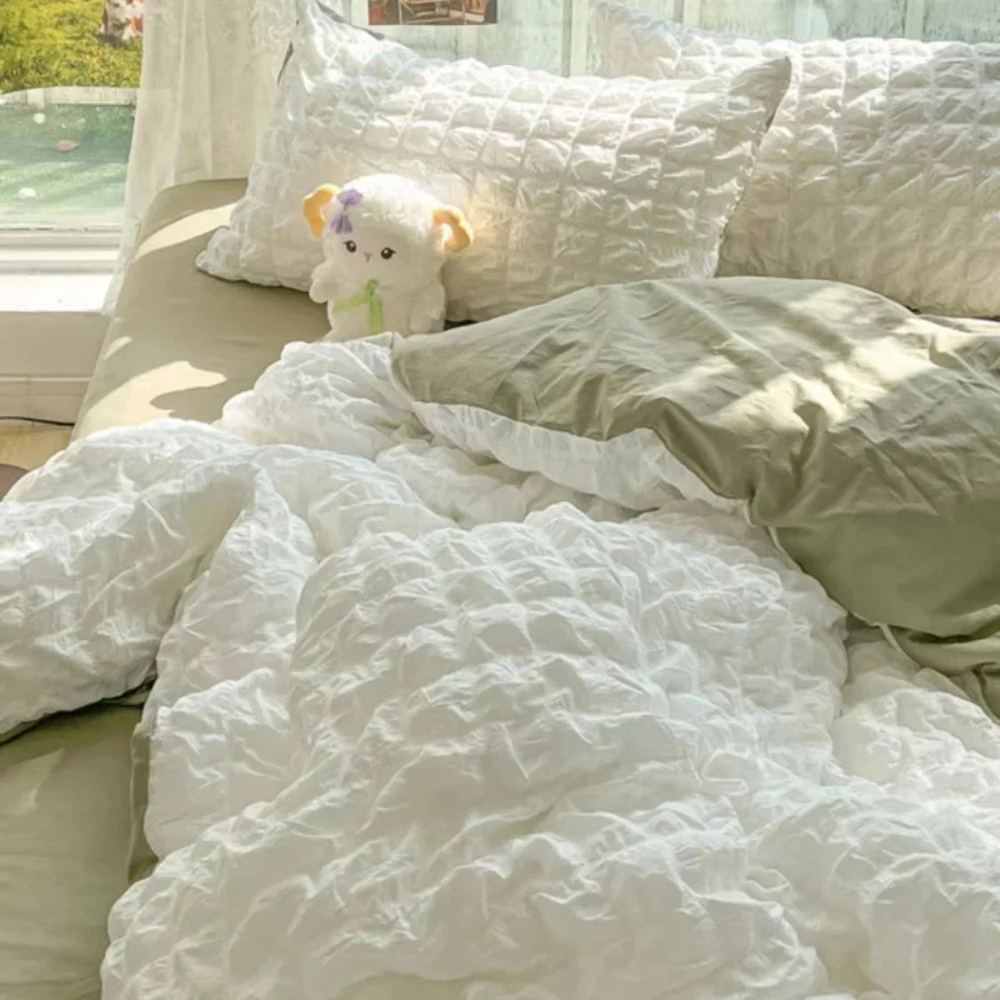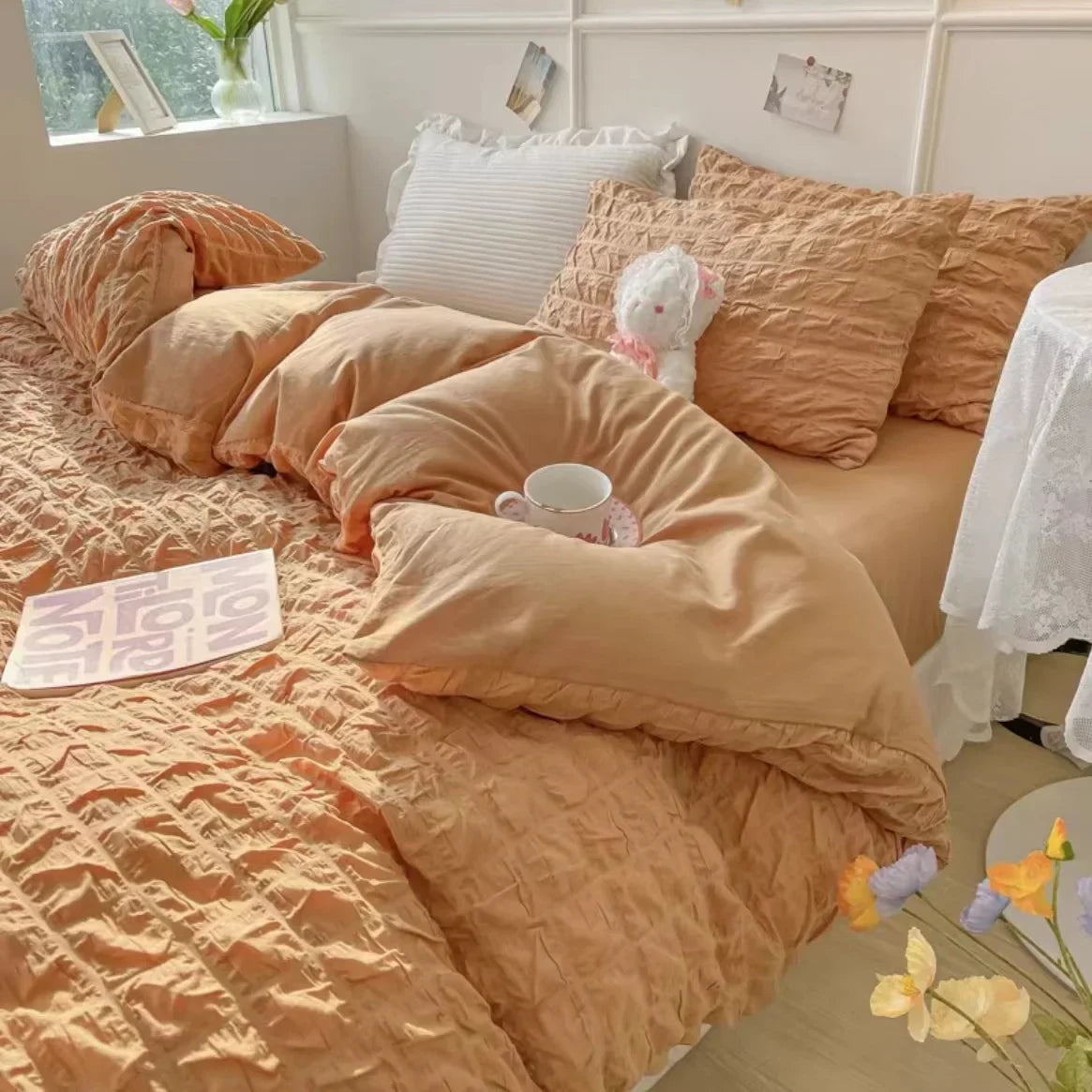 Yeknu Princess Bedding Set French Style Wash Cotton Solid Color Seersucker Summer Soft 4New Bed Sheet Set Comforter Set