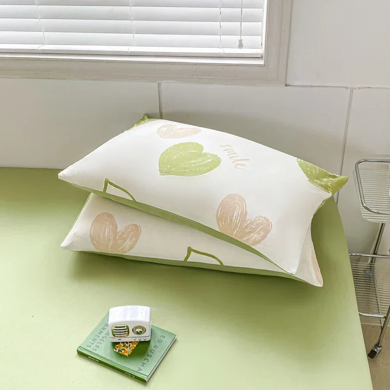 Yeknu Sweet Green Heart-Shaped Princess Girls Duvet Covers Simple Quilt Cover Bed Flat Sheet Pillowcase Washed Cotton Bed Linens