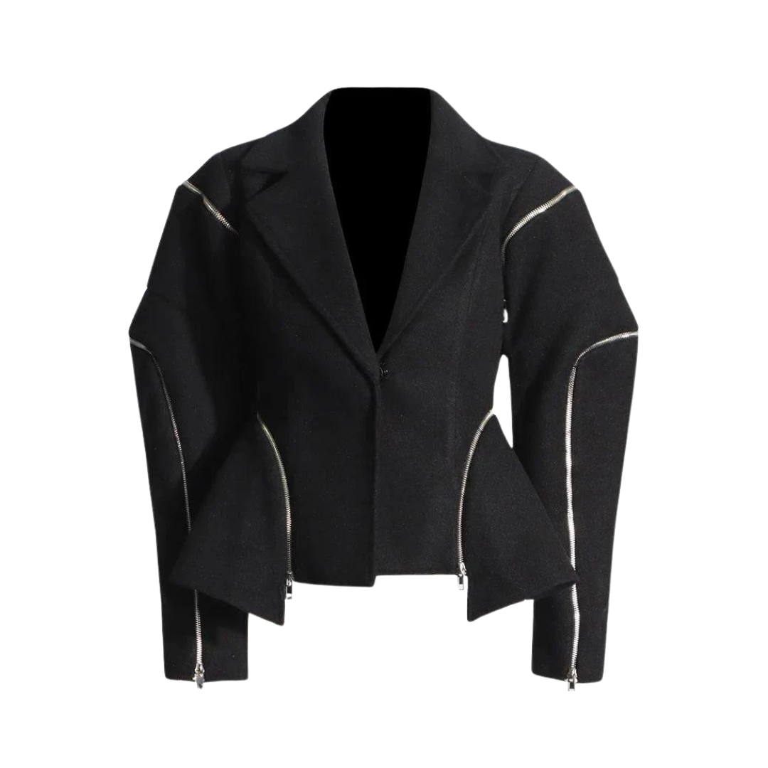 Expertly crafted with a unique zipper splicing and deconstructed design. this irregular suit jacket exudes modern sophistication. Elevate your style game with this statement piece that effortlessly combines edgy and refined elements for a truly dynamic look.